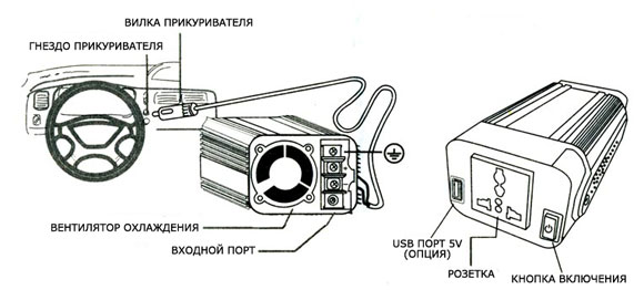 Автомобильный инвертор — преобразователь напряжения 12 220 — принимает постоянное напряжение 12–24 В и преобразует его в переменное на выходе — 220 В. Преобразование напряжение происходит внутри самого устройства.